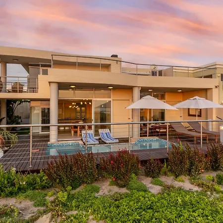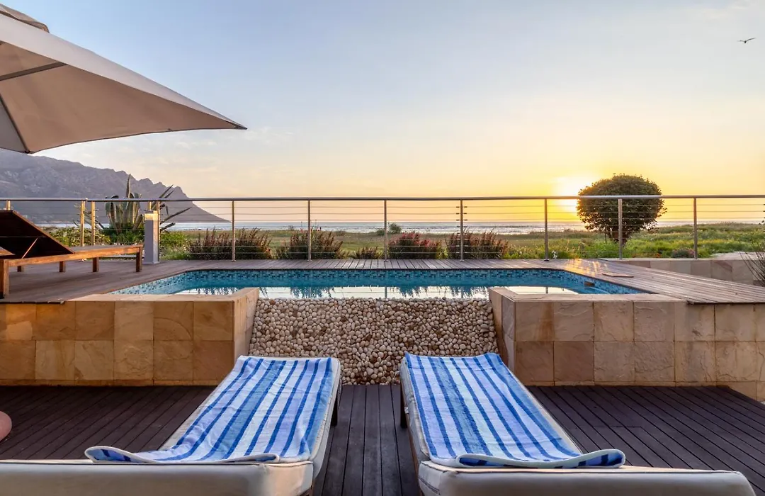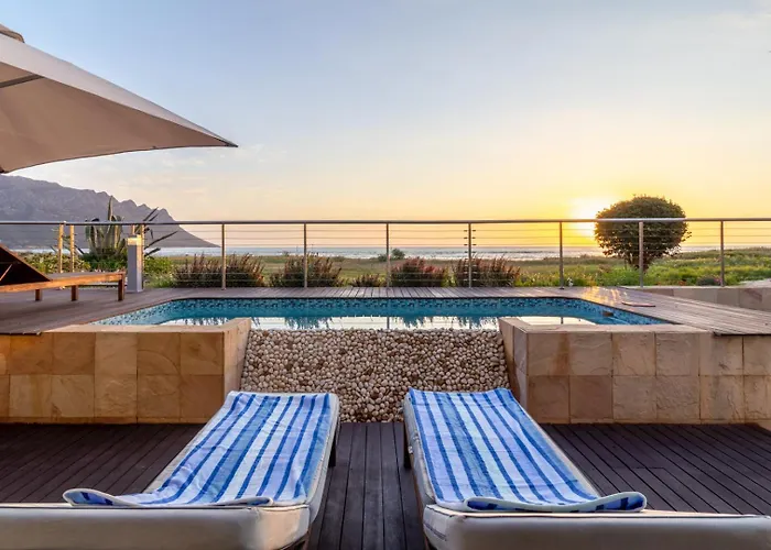 Guests can enjoy a seaside mountain view from a terrace at the beachfront "Villa Montemar' Luxury Villa For 6 On The Beach With Pool Gordons Bay, 10 minutes' drive from the Voortrekker Park Resorts.